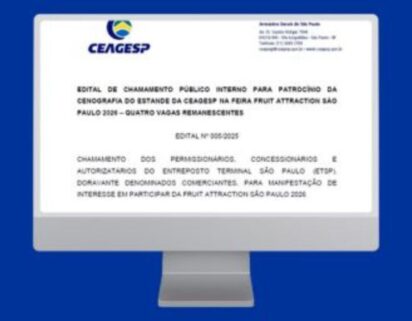 O Chamamento Público Interno para a seleção de comerciantes do Entreposto Terminal São Paulo (ETSP) interessados em expor na 3ª edição da Fruit Attraction São Paulo, que ocorrerá entre 24 e 26/03/2026 no São Paulo Expo & Convention Center, foi prorrogado. Agora as inscrições para patrocínio de cenografia e compartilhamento de custos de montagem e decoração do estande da CEAGESP na feira irão de 18 até as 17h de 30/09, com a finalidade de preencher quatro vagas remanescentes.