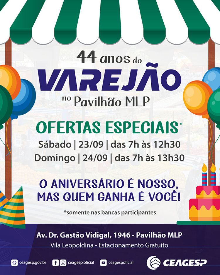 O horário de atendimento é amplo, indo no sábado das 7 às 12h30 e no domingo, das 7 às 13h30. “Temos estacionamento gratuito para realizar as compras com tranquilidade e quem tiver um pouquinho de fome conta com as bancas de alimentação”, conta Maurício. A CEAGESP dá as boas-vindas e convida a todos para que festejem conosco. “Felicidades para o Varejão”, deseja o gerente do DEPEC.