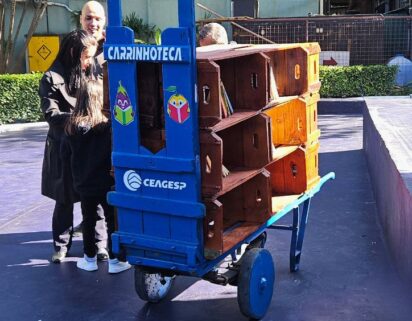 “Adaptamos um carrinho para que se transformasse numa pequena biblioteca itinerante. Optamos pela inclusão de caixotes de madeira para acomodação dos livros”, conta Beto. Nas prateleiras adaptadas da Carrinhoteca estão obras de José de Alencar, Machado de Assis, Augusto Cury, entre outros.