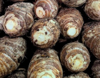 O inhame (Colocasia esculenta L. Schott), também conhecido como taro, tem sua origem provável no Sudeste Asiático ou na Índia, com seu nome sendo originário do termo africano nyami ou nãme. Pertencente à família Araceae, é uma hortaliça tuberosa cuja domesticação ocorreu há mais de 7 mil anoss. Espalhou-se pelas ilhas do Pacífico e pela África, chegando às Américas via colonização portuguesa e rotas comerciais. No Brasil, na região Nordeste, costuma ser confundido com o cará, do gênero Dioscorea, que em algumas regiões é também chamado de “inhame”.