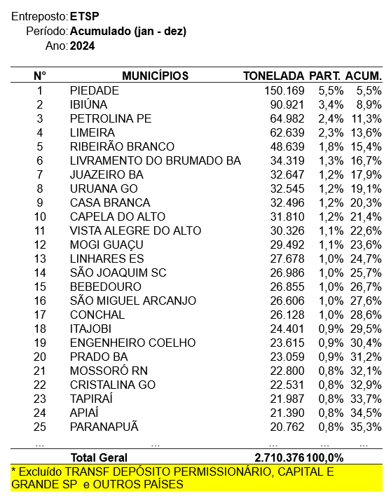 Produção nacional — Responsável pela imensa maioria (94,5%) do que é negociado no ETSP, a produção agrícola brasileira foi responsável por 2.914.182 toneladas vendidas no ETSP. No ranking estadual, em comparação a 2023, ficaram inalterados os quatro estados que mais enviam produtos, conforme pode ser visto no ranking abaixo: