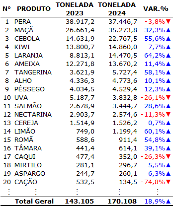 Importações — A produção vinda de fora responde significativamente na pauta de alguns produtos vendidos na matriz da CEAGESP e contabilizou um total de 170.092 toneladas. Os principais países nesse volume são os seguintes: