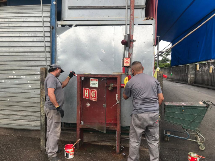 O procedimento está sendo feito devido ao desgaste dos dispositivos, além de levar em conta funcionalidade e visual. Esses abrigos são majoritariamente feitos de concreto para que resistam a eventuais impactos dos carrinhos que circulam pelo entreposto, em trabalho vem sendo coordenado por Pedro de Souza Dias, profissional de serviços operacionais da Seção de Segurança e Medicina do Trabalho (SESMT). “A gente primeiro lava, depois pinta, recupera e reequipa. Colocamos equipamentos novos: mangueira, bico, cadeado etc.”, relata.