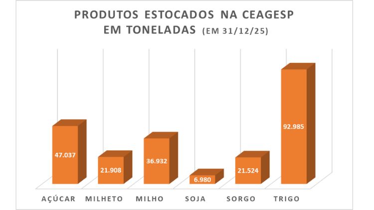 Com 40,9% do total, o trigo foi o produto agrícola com maior volume estocado no final de 2025. Na sequência, vieram açúcar (20,69%), milho (16,24%), milheto (9,64%), sorgo (9,46%) e soja (3,07%).