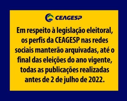 Durante o período de defeso eleitoral de 2022, a partir de 02 de julho até o fim de outubro, caso haja 2º turno nas Eleições, a Companhia de Entrepostos e Armazéns Gerais de São Paulo (CEAGESP), por ser uma empresa pública federal vinculada ao Ministério da Economia, limitará suas publicações e suas divulgações de conteúdos informativos.