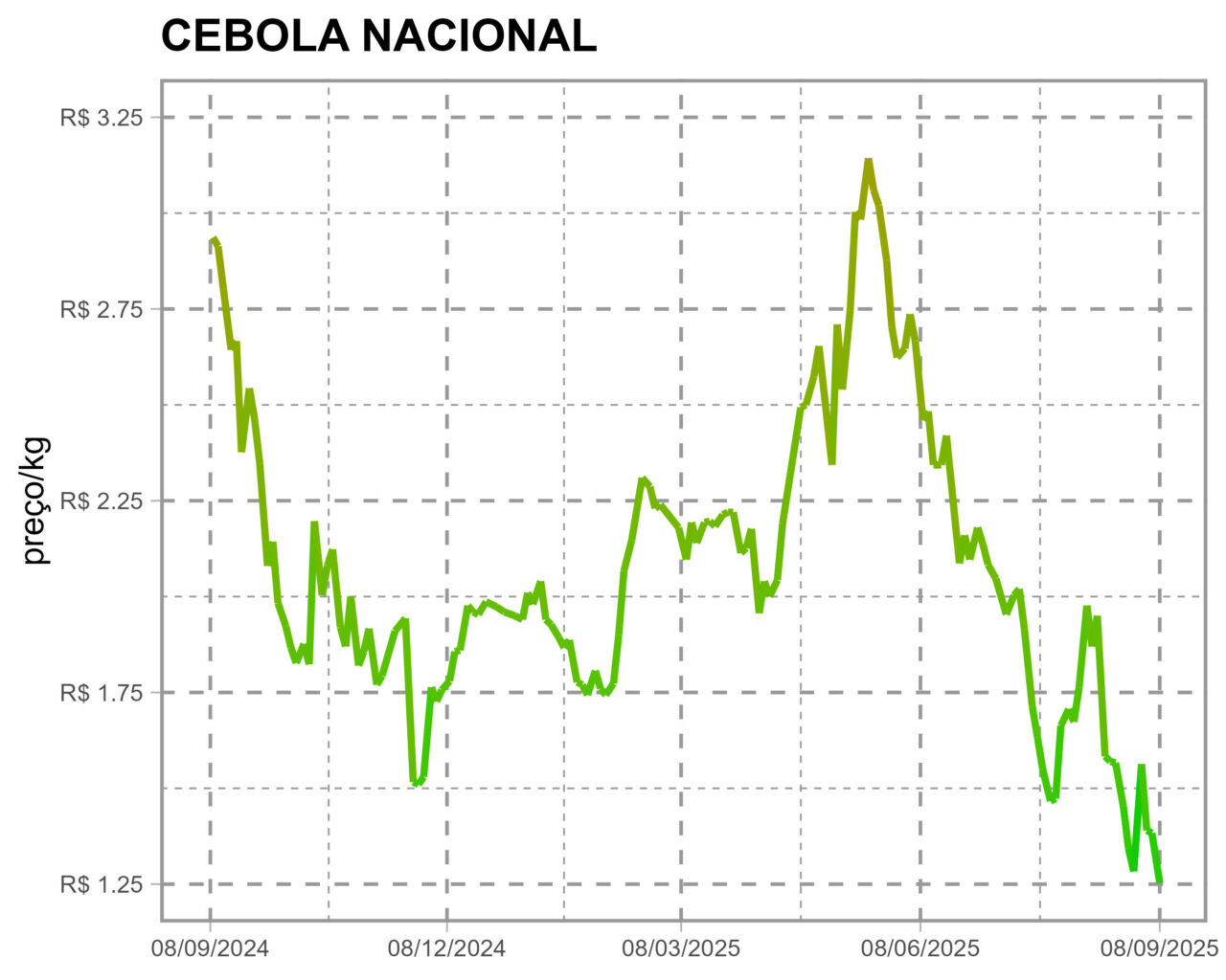 Em cotação realizada na segunda-feira, 08/09, a cebola nacional estava a R$ 1,25/kg no atacado da CEAGESP, sendo o menor preço da série avaliada. Dados da Seção de Economia e Desenvolvimento (SEDES) da Companhia indicam que, na mesma época do ano passado, o bulbo foi cotado a R$ 2,94/kg. Dessa forma, o produto apresenta uma redução média anual de 57,5%. Na comparação mensal, a redução média é de 31,7%.