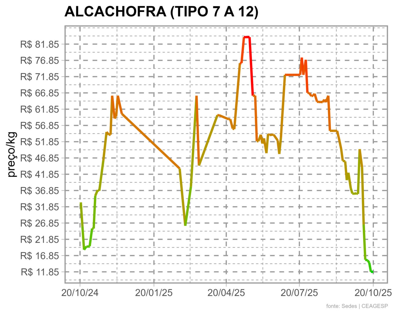 Em cotação realizada na segunda-feira, 20/10, a alcachofra estava a R$ 11,85/kg no atacado da CEAGESP. Dados da Seção de Economia e Desenvolvimento (SEDES) da Companhia indicam que, na mesma época do ano passado, a flor comestível foi cotada a R$ 33,20/kg. Dessa forma, o produto apresenta uma 64,3%. Na comparação mensal, a redução média é de 68,4%. “É o menor preço dos últimos 12 meses”, destaca Thiago de Oliveira, chefe da SEDES.