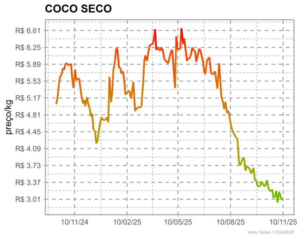 Em cotação realizada na segunda-feira 10/11, o coco seco estava a R$ 3,00/kg no atacado da CEAGESP. Dados da Seção de Economia e Desenvolvimento (SEDES) da Companhia indicam que, na mesma época do ano passado, ele foi cotado a R$ 5,78/kg.