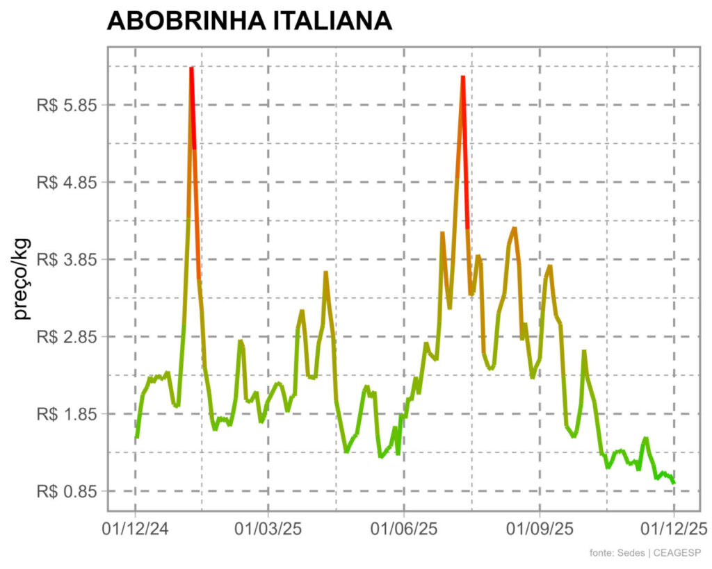 Em cotação realizada na segunda-feira, 01/12, a abobrinha italiana estava a R$ 0,94/kg no atacado da CEAGESP. Dados da Seção de Economia e Desenvolvimento (SEDES) da Companhia indicam que, na mesma época do ano passado, ela foi cotada a R$ 1,53/kg.