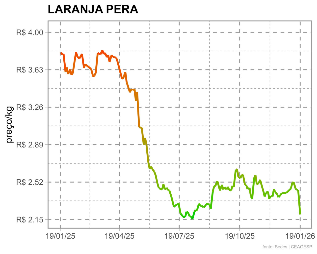 Em cotação realizada na segunda-feira, 19/01, a laranja pera estava a R$ 2,20/kg no atacado da CEAGESP. Dados da Seção de Economia e Desenvolvimento (SEDES) da Companhia indicam que, na mesma época do ano passado, a fruta foi cotada a R$ 3,80/kg.
