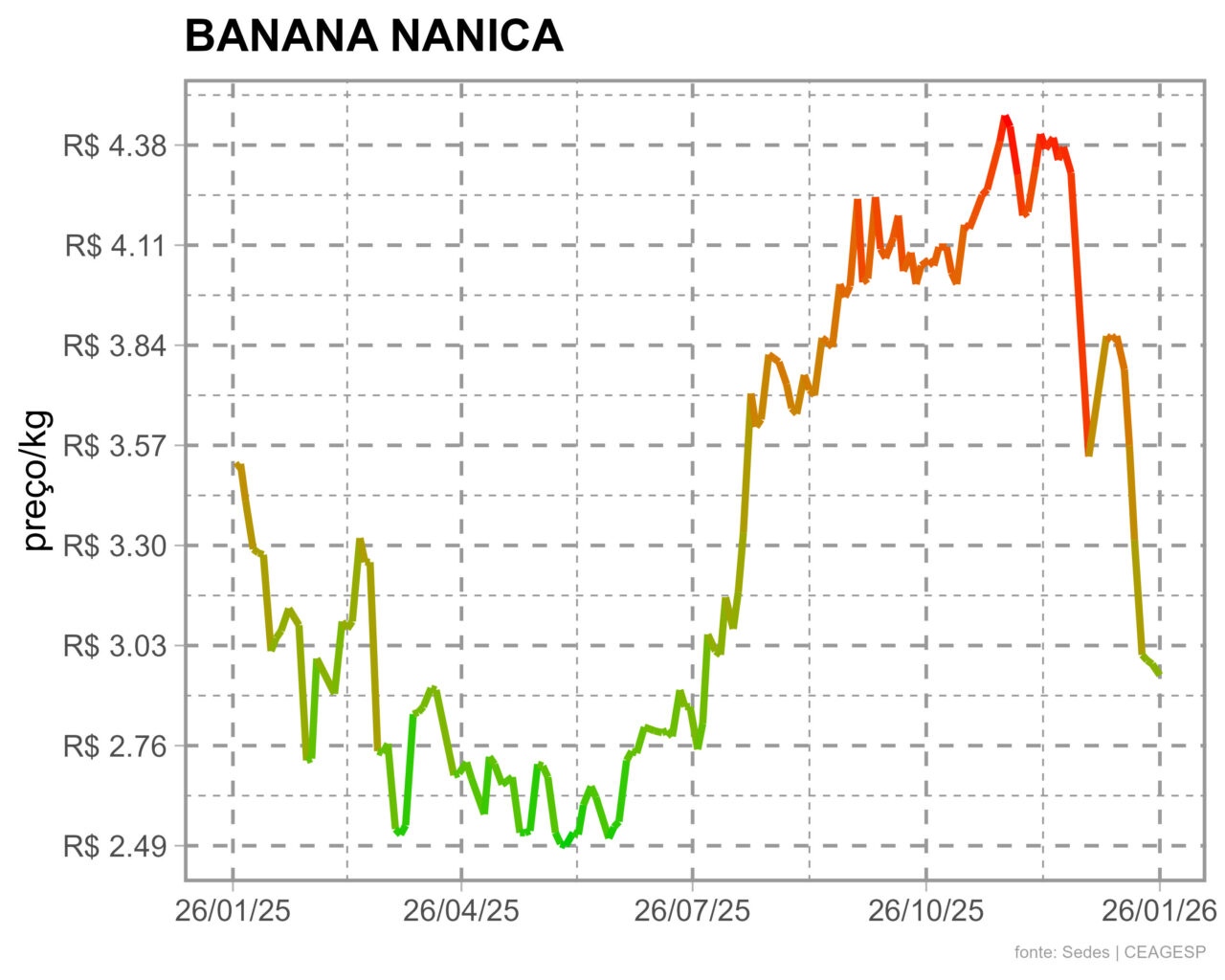 Em cotação realizada na segunda-feira, 26/01, a banana-nanica foi cotada ao preço médio de R$ 2,95/kg no atacado da Ceagesp. Dados da Seção de Economia e Desenvolvimento (SEDES) da Companhia indicam que, na mesma época do ano passado, o produto havia sido cotado a R$ 3,51/kg. Dessa forma, o produto apresenta uma redução média anual de 16%. Na comparação mensal, a redução média é de 16,7%.