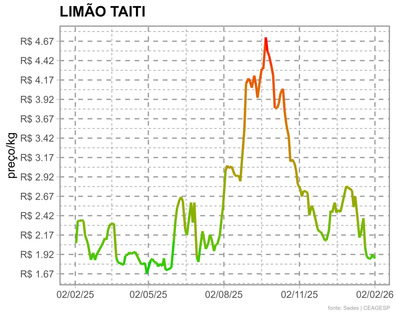 Em cotação realizada na segunda-feira, 02/02, o limão taiti estava a R$ 1,87/kg no atacado da Ceagesp. Dados da Seção de Economia e Desenvolvimento (SEDES) da Companhia indicam que, na mesma época do ano passado, o cítrico foi cotado a R$ 2,07/kg.