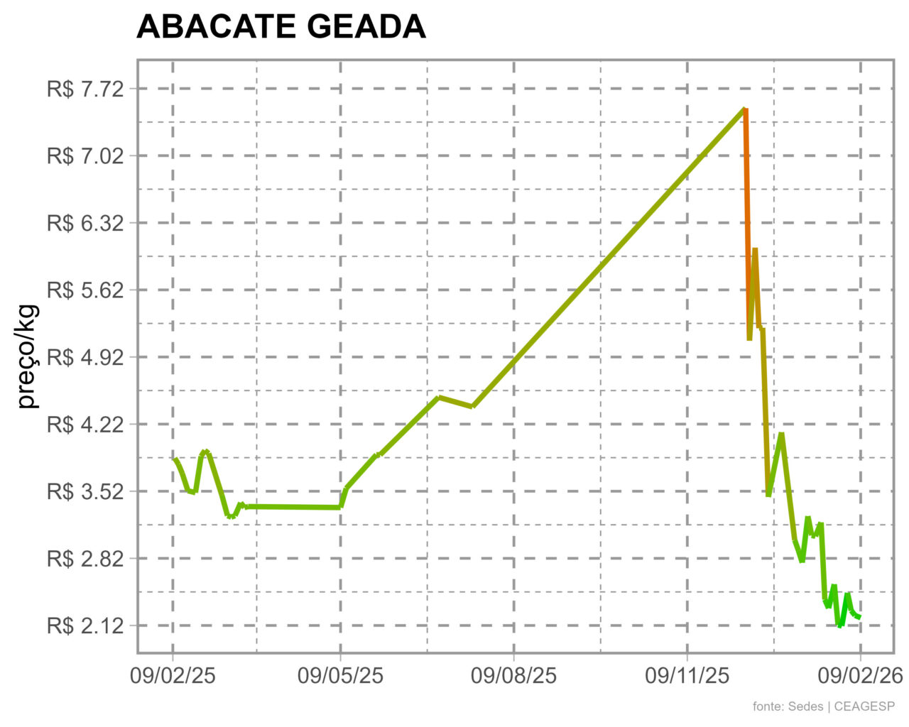 Em cotação realizada na segunda-feira, 9/02, o abacate geada estava a R$ 2,20/kg no atacado da Ceagesp. Dados da Seção de Economia e Desenvolvimento (SEDES) da Companhia indicam que, na mesma época do ano passado, o produto estava cotado a R$ 3,87/kg.