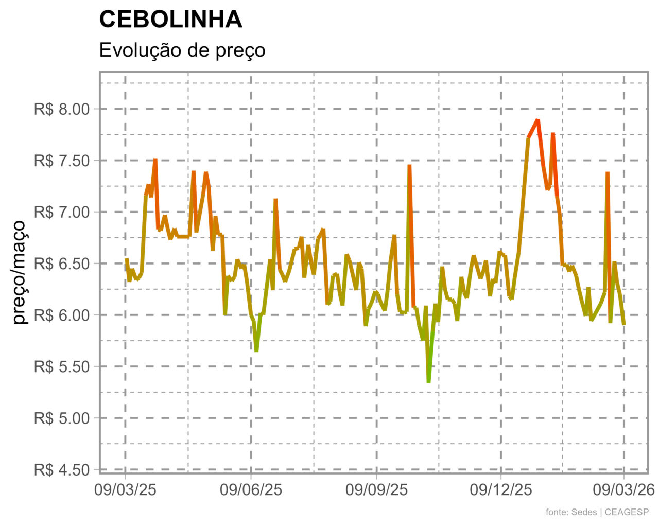 Em cotação realizada na segunda-feira, 9/03, a cebolinha estava a R$ 5,89/maço no atacado da Ceagesp. Dados da Seção de Economia e Desenvolvimento (SEDES) da Companhia indicam que, na mesma época do ano passado, o produto estava cotado a R$ 6,55/maço. Dessa forma, o produto apresenta uma redução média anual de 10,1%. Na comparação mensal, a redução média é de 1,7%.