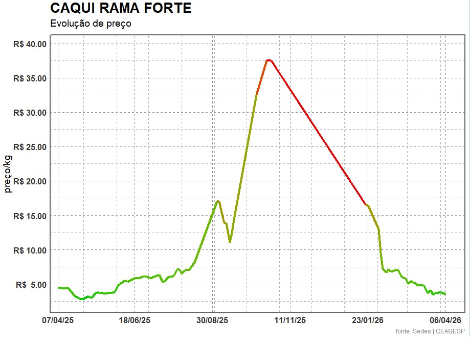Em cotação realizada na segunda-feira, 06/04, o caqui Rama Forte estava a R$ 3,50/kg no atacado da CEAGESP. Dados da Seção de Economia e Desenvolvimento (SEDES) da Companhia indicam que, na mesma época do ano passado, a fruta foi cotada a R$ 3,84/kg. Dessa forma, o produto apresenta uma redução média anual de 8,9%. Na comparação mensal, a redução média é de 21,5%.