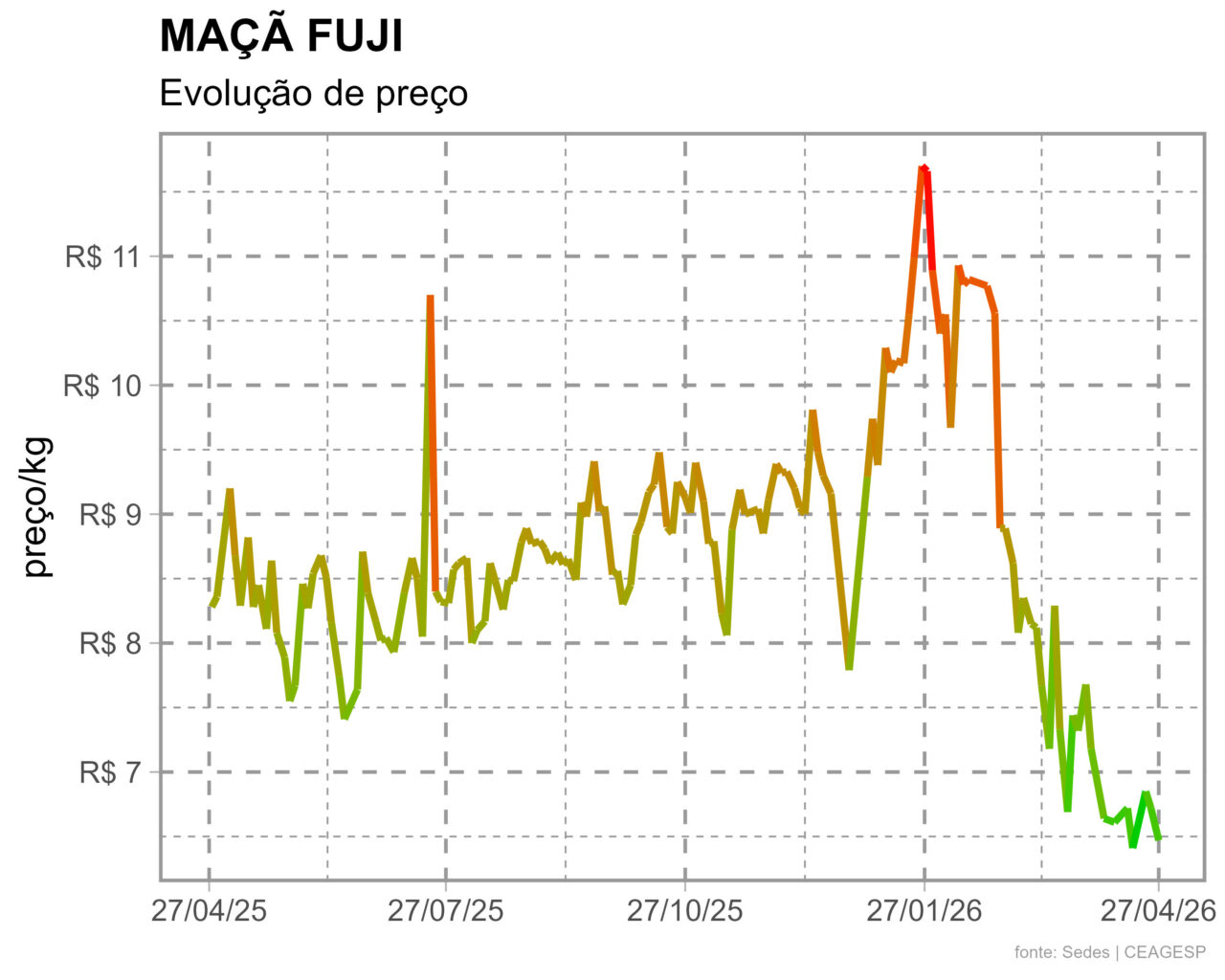 Em cotação realizada na segunda-feira, 27/04, a maçã Fuji estava sendo comercializada a R$ 6,47/kg no atacado da CEAGESP. Dados da Seção de Economia e Desenvolvimento (SEDES) da Companhia indicam que, na mesma época do ano passado, o produto foi cotado a R$ 8,28/kg. Dessa forma, o produto apresenta uma variação média anual de -21,9%. Na comparação mensal, a variação média é de -11,6%.