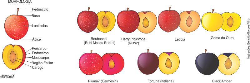 | Grupo de mercado | Formato | Coloração da casca | Coloração da polpa | Aderência do caroço | Embalagem e peso mais comum |