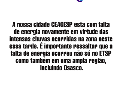 A nossa cidade CEAGESP esta com falta de energia novamente em virtude das intensas chuvas ocorridas na zona oeste essa tarde. É importante ressaltar que a falta de energia ocorreu não só no ETSP como também em uma ampla região, incluindo Osasco.