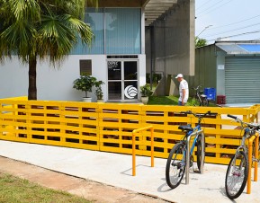 Bancos feitos de pallets usados ficam em frente ao DEPEC